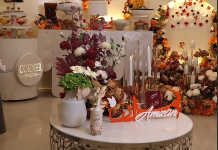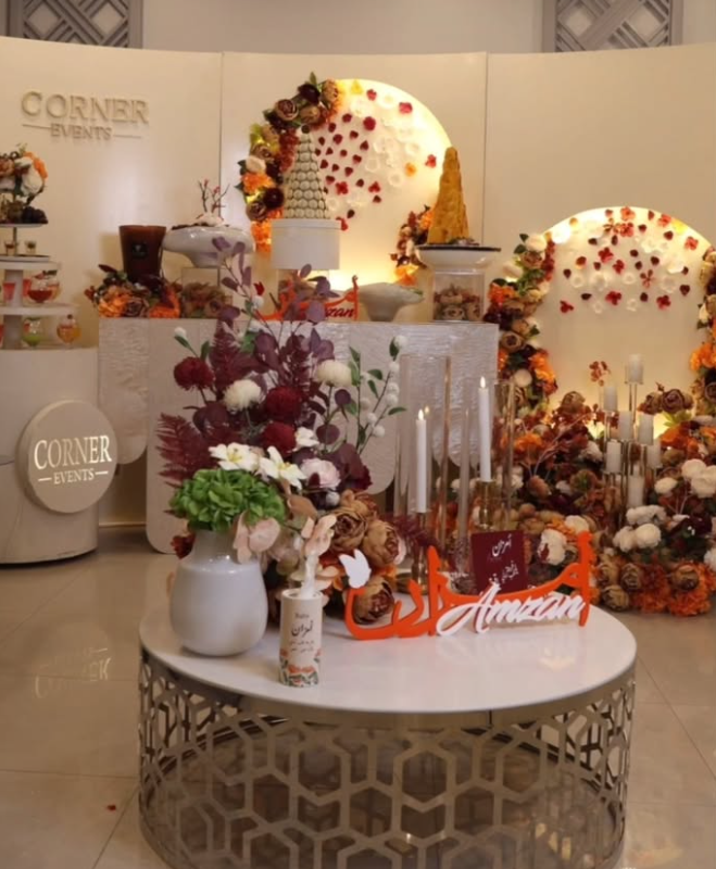 | – ديكور أنيق بلمسات زهرية راقية | – ديكور فاخر مع علامة تجارية شخصية وزهور فاخرة |