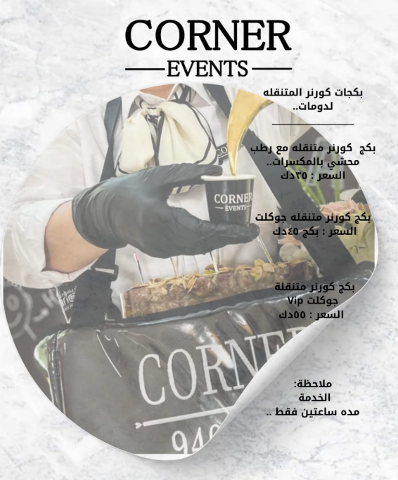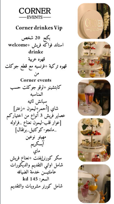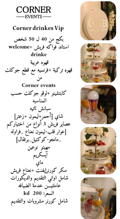 صُمّم ركن المشروبات لدينا بعناية فائقة ليُنعش ضيوفك ويُضفي لمسةً أنيقةً على احتفالك. من محطات المشروبات المُقدّمة بشكلٍ جميل إلى الخدمة السلسة والاحترافية، نضمن أن تُكمّل كل رشفةٍ أناقة مناسبتك.